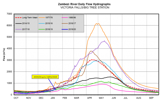 Dermed peger det på, at dette år ikke er noget betydeligt faretruende. Grafen viser vandstanden helt tilbage til 1977/78, og målingerne fra i år ligger på nuværende tidspunkt kun en smule under gennemsnittet. Ifølge flere lokale medier er vandmængderne lavere end normalt på grund af, at en tørkeperiode har sat ind samtidig med lavsæsonen. Hvorvidt den lave mængde af regn skyldes klimaforandringer, er svært at fastslå. Dog var vandstandens stigning i december 2019 højere end det forgangne år, og således ser det ikke ud til, at tilstanden i Victoria Falls er problematisk. Der er altså ingen grund til at afholde sig fra et besøge det mægtige vandfald.