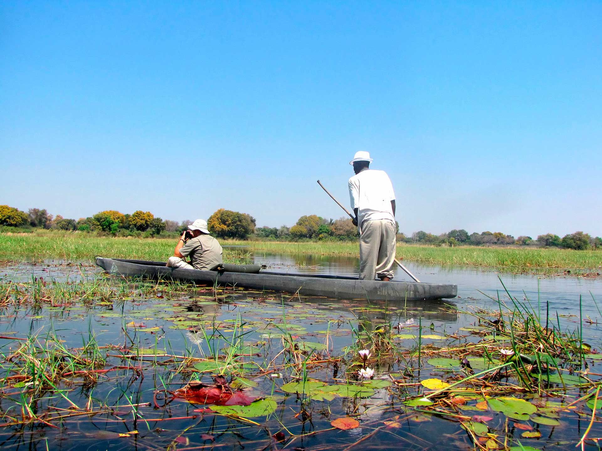 Botswana bliver ofte beskrevet som landet med uberørte landskaber, uspoleret natur samt intens og autentisk stemning – og det er lige hvad det er. Særligt anbefales det at opleve det fantastiske landskab fra vandet. I Okavango-deltaet og ved Linyanti-sumpene kan du få en lydløs og idyllisk sejltur i Mokoroer, der er primitive kanoer i form af udhulede træstammer. De seneste år er Mokoroerne dog blevet produceret i plast for at skåne de store træer, de traditionelt blev fremstillet af. Kulissen for sejlturen sættes af det krystalklare vand og den smukke natur. Undervejs kan du opleve flodheste og vandlevende antilopearter som den røde lechwe og vandbukken. Botswanas mange store stjerner i form af den enorme elefantbestand går du bestemt heller ikke glip af på sejlturen. Elefanterne trives nemlig i hele deltaet, både i de våde og i de mere tørre miljøer, og du kan sagtens komme ganske tæt på dem fra båden.