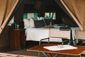 Denne indkvartering er en bush camp men i glamping standard da I her får den fulde naturoplevelse i bushen samtidig med, at der bliver sørget for jer på alle parametre. Det betyder, at I har en guide og en camp-assistent plus en kok med på hele turen. Ved hvert skift af safariområde tager I blot på safari med jeres guide. Imens sørger camp-assistenten og kokken for at bryde campen ned og slå den op igen på det nye sted. Det betyder, at I ankommer til campen om eftermiddagen, hvor alt står klart. Kokken og camp-assistenten sørger også for dejlige måltider. I overnatter i bushen i nationalparkerne. Der bliver dækket op med tallerken, bestik og med på turen er et mobilt køkken. Det er ren forkælelse midt ude i naturen. I overnatter i komfortable luksustelte med eget bucket-shower & bush-toilet. Teltene er 3mx3mx195m og bliver redt op til jer med gode fletsenge og madrasser. Der er plads til 2 personer i hvert telt. (Enkeltmands-telt kan forespørges mod et tillæg)