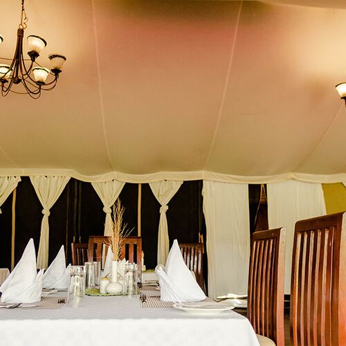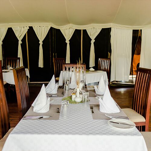Aftenens ala carte- eller buffetmiddag efter dagens game drive er en essentiel safarioplevelse. Gæster kan nyde smagen af Afrika, mens solen går ned.