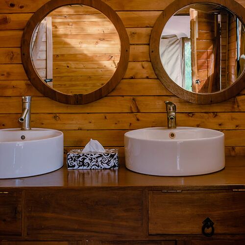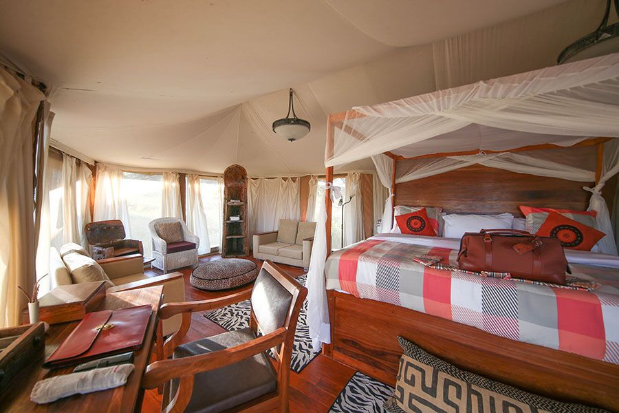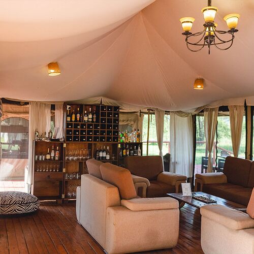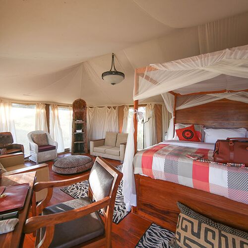Familieværelset tilbyder tilstrækkelig privat plads til større grupper, med eget badeværelse, flere senge og en sofa. Beliggende på lejrens sletter omgivet af dyreliv, giver det fuld komfort og luksus.