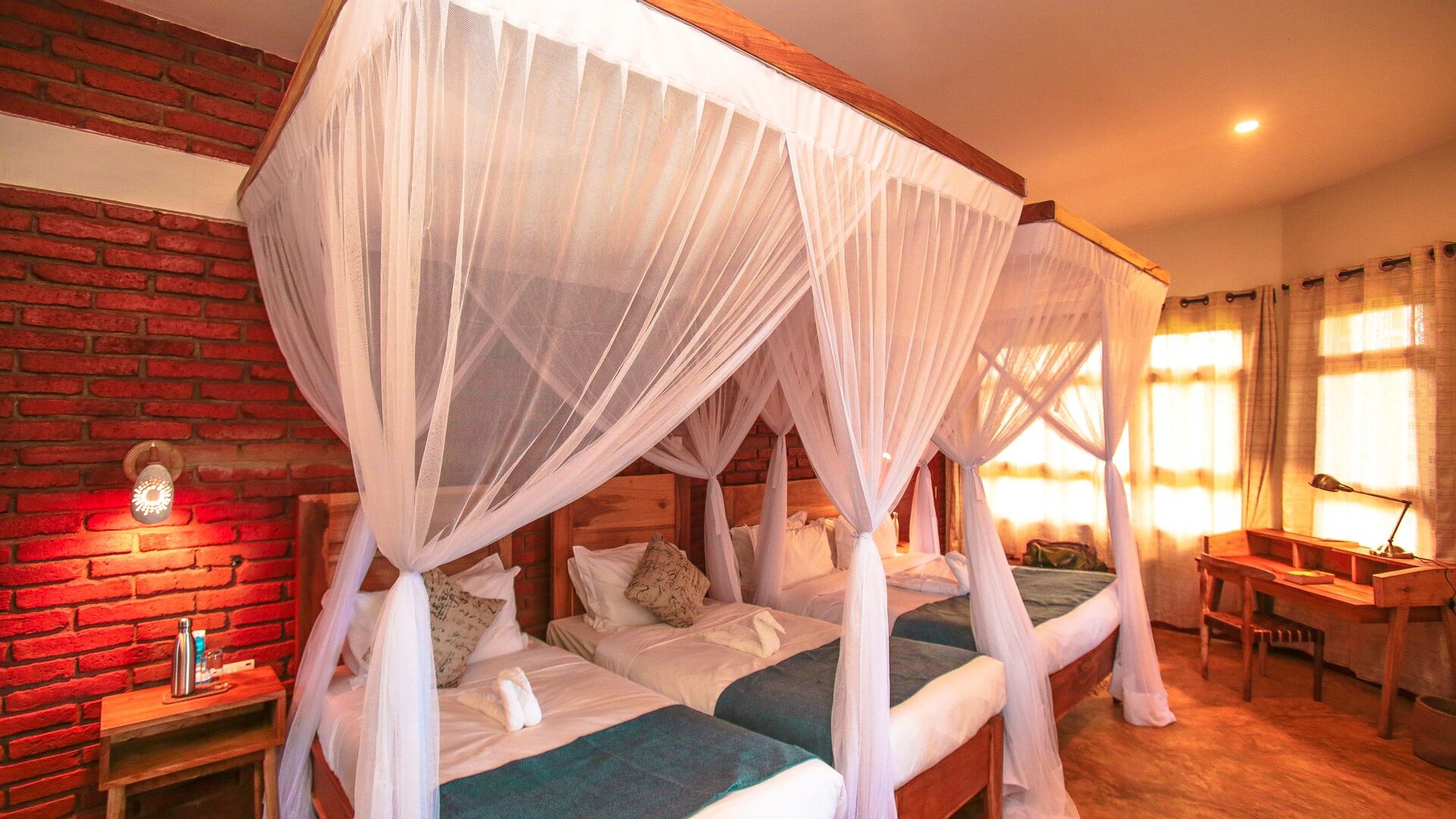 Soveværelserne har enkeltsenge eller queensize-senge, og familiesuiterne har flere sengekonfigurationer til hele familiens ønsker. Familiesuiter kan også gøres større gennem de tilstødende værelser. Blødt linned og håndklæder plus et skrivebord, læsestol og rigelig plads til bagage kombineres for at skabe et hyggeligt og indbydende pusterum fra den støvede safaristi.