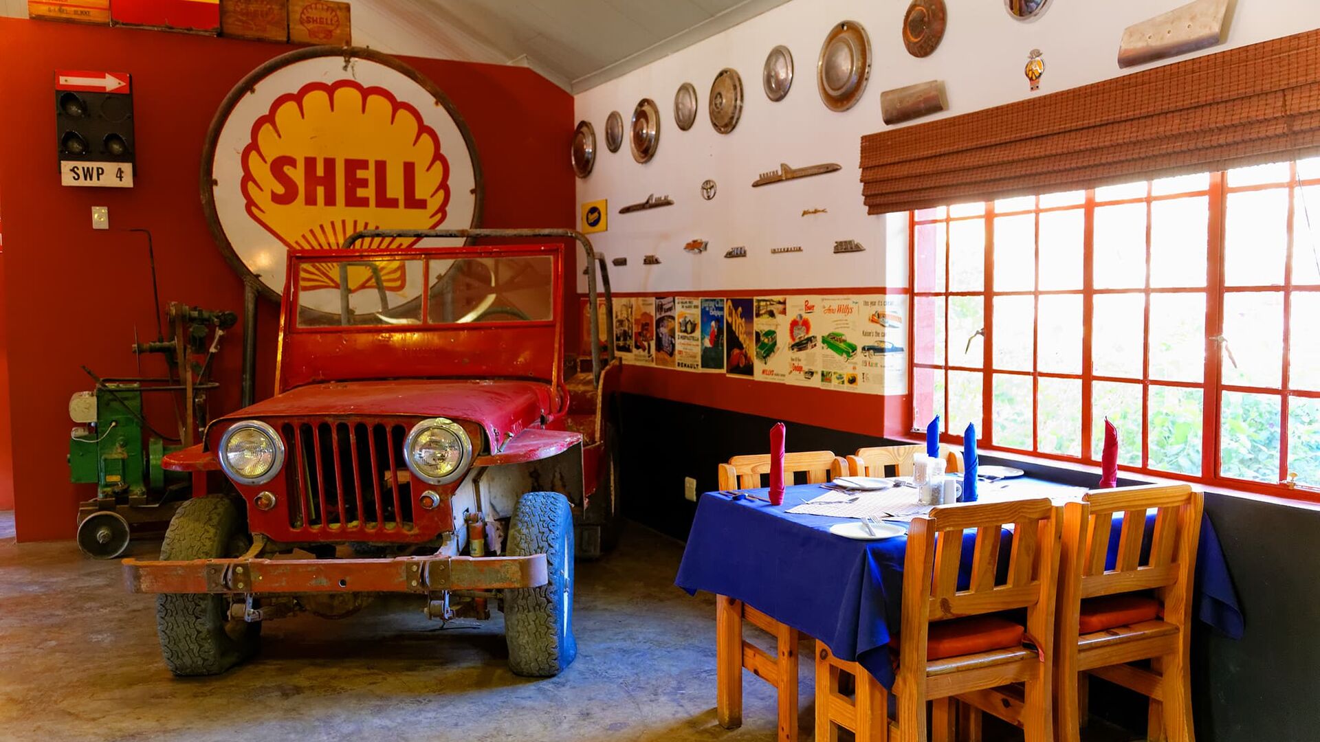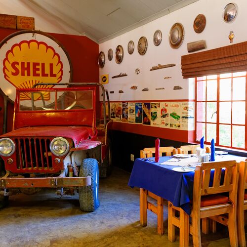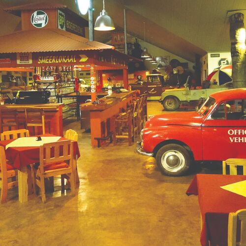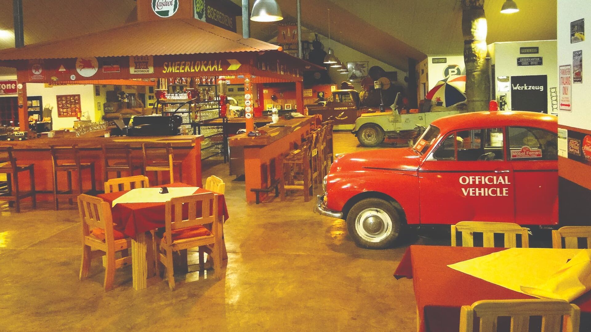Når du åbner de store døre, vil du føle, at du træder ind i en skatkiste af spændende overraskelser. Her møder du en receptionsskranke, der er omdannet til en gammel International lastbil, en bar inspireret af en benzinstation ('pompstasie'), og en samling af klassiske køretøjer og transportrekvisitter, som er sammensat med en kreativ og humoristisk flair. Restaurantbordene er placeret mellem disse unikke indretningselementer, og i de kølige vintermåneder giver de originale bilkabiner en skæv og hyggelig atmosfære som pejse.