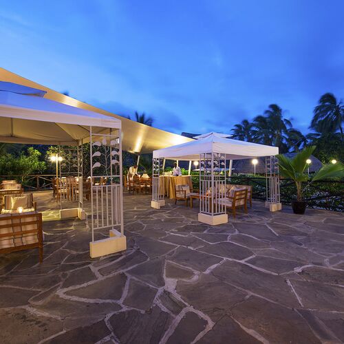 Resortet har faciliteter som to restauranter, udendørs swimmingpool, strandparasoller og fitnessfaciliteter.