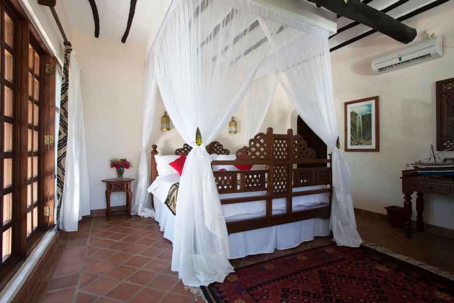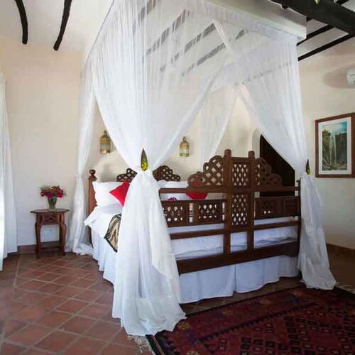 Præsenteret med typisk swahili-elegance har værelserne håndskårne hårdttræsmøbler og king-size eller to enkeltsenge (med myggenet). Værelserne; Azure, Lapis, Kobolt, Teal og Sky værelser har elegante franske døre, der fører til en privat terrasse med direkte adgang til poolen; Kingfisher-værelset har separat indendørs siddeområde og egen skyggefuld terrasse i haven. Hvert værelse er forsynet med sine egne liggestole og parasol ved poolen.