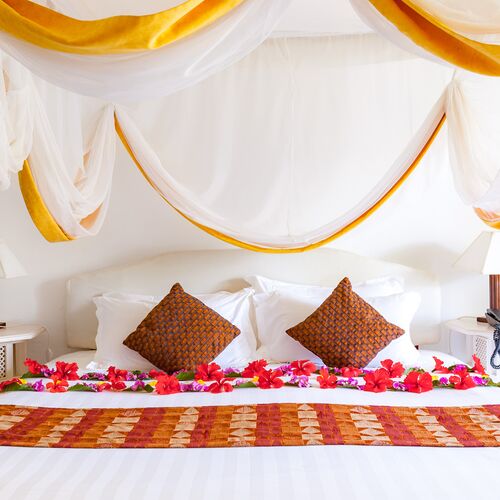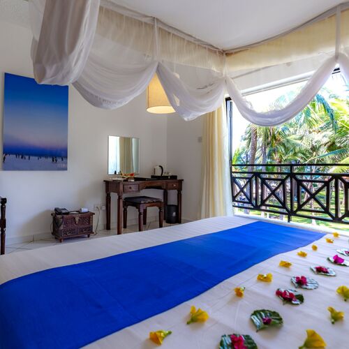 Nyd omgivelserne på altanen med en smuk sideudsigt over Det Indiske Ocean, tættere på poolen og havet. Alle møbler er lavet af lokalt træ i lokal afrikansk stil. De har myggenet, split-level aircondition, pengeskab, bruser, toilet, bidet samt telefon, minikøleskab, som genopfyldes dagligt af all inclusive madplanen, tefaciliteter og satellit-tv.