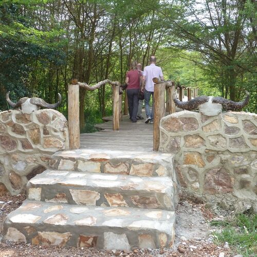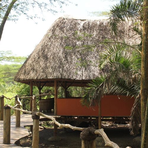 Fra den stråtækte restaurant og bar kan den hjemmelavede mad fra lodgens egen økologiske have nydes, mens man ser på den naturskønne lille naturlig sø. Store flokke af elefanter, bøfler og antiloper er regelmæssige besøgende på lodgen, mens sartede aber, bavianer og sort/hvid colobus er blevet beboere. Ikke at forglemme det rigelige fugleliv, som gør Enjojo til et drømmemiljø for fuglefolk!