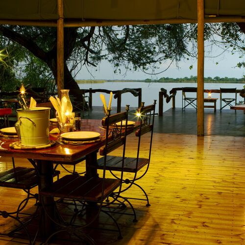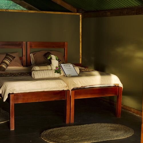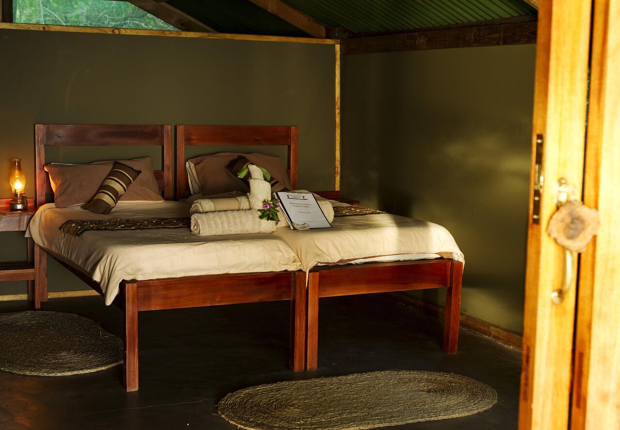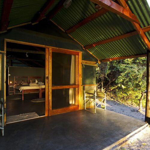 Accommodation is provided in 10 large canvas chalets each with their own private view of the lagoon. Each chalet can accommodate two people and offers lovely teak beds, en-suite bathrooms with hot showers and flush toilets. Awake in the morning with the sunrise over the lagoon streaming into your chalet. Wonder down to the main area and sit on the deck over the lagoon with a complimentary cup of tea or coffee.