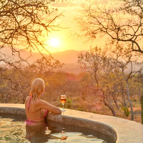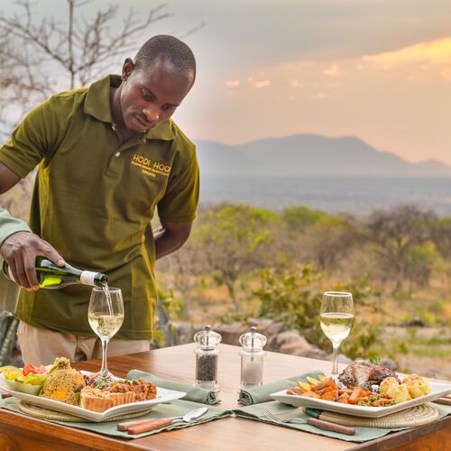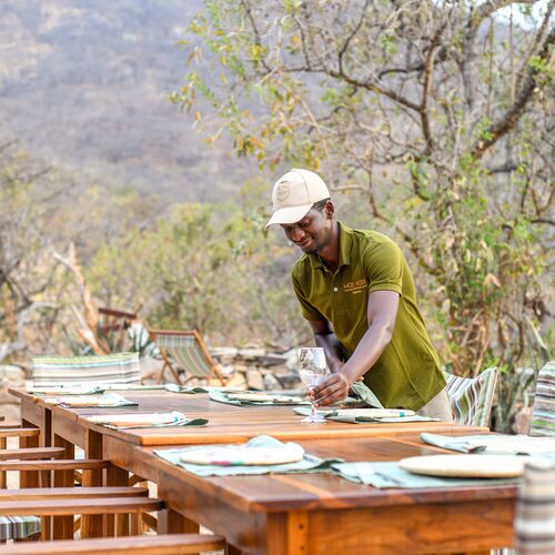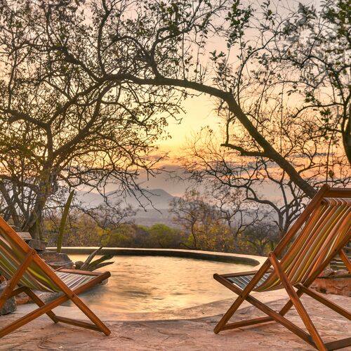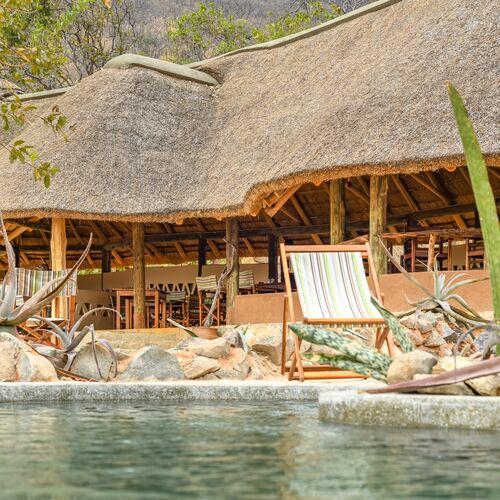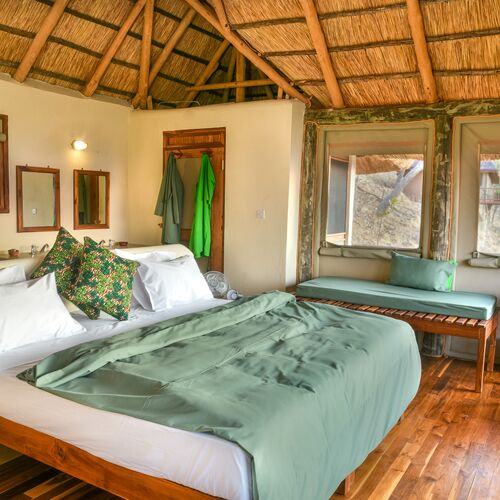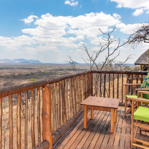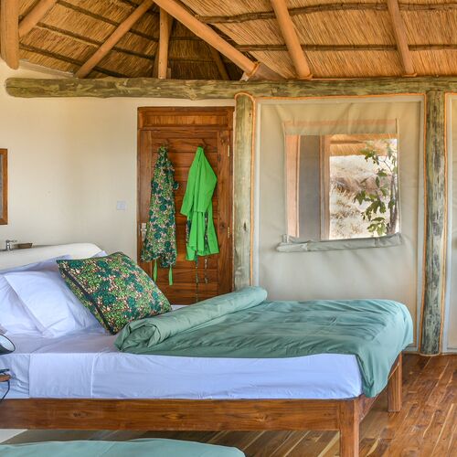 Teltsuiterne er lækkert indrettede med stor møbleret teaktræs balkon med behagelige møbler, hvor man kan sidde og nyde den fantastiske udsigt, store rummelige soveværelser med gode senge, samt murede badeværelser med toilet, bruser og håndvask. Teltdugene har åbne sider, naturligvis med insektnet, så man kan nyde udsigten også inde fra teltet, og alle teltsuiter har stråtag. Måltiderne indtages normalt omkring et stort åbent ildsted, og ved baren og loungen er der også en lille pool samt udsigt til det nedenfor liggende vandhul, hvor flere forskellige dyr, bl.a. kudu, impala, zebra, bavianer og vortesvin kommer for at drikke. Med lidt held kan både elefanter og leoparder også komme forbi.