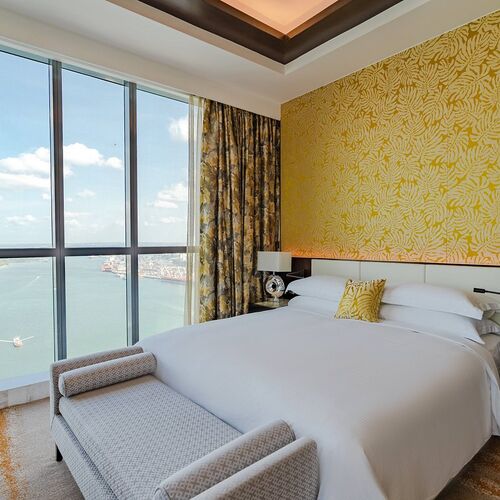 En rummelig suite på 65 kvm med lounge, valgbar by- eller havudsigt, separat opholdsstue og køkken samt king-size seng.