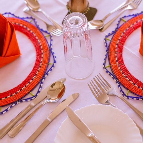 Hovedteltet er rummeligt og godt ventileret med spiseborde og spisebordsstole, bestik, porcelæn, duge og andre faciliteter. Campen serverer tre måltider om dagen – morgenmad, frokost og aftensmad; med 3 retters menu til frokost og middag. Aftenerne bruges socialt omkring et knitrende lejrbål i et fredfyldt og roligt område – dog indimellem afbrudt af fjerne dyrekald.