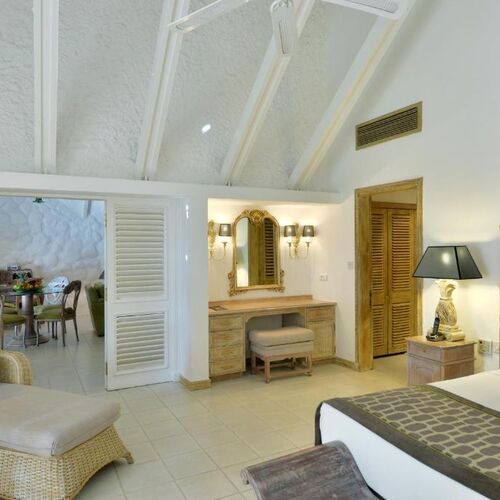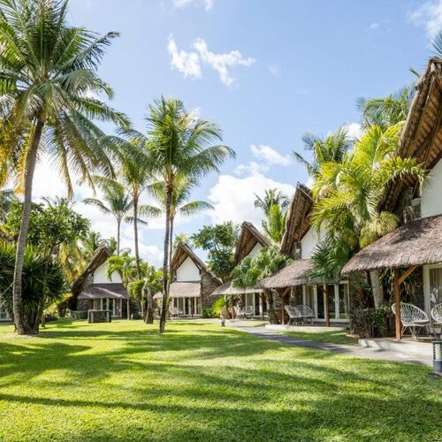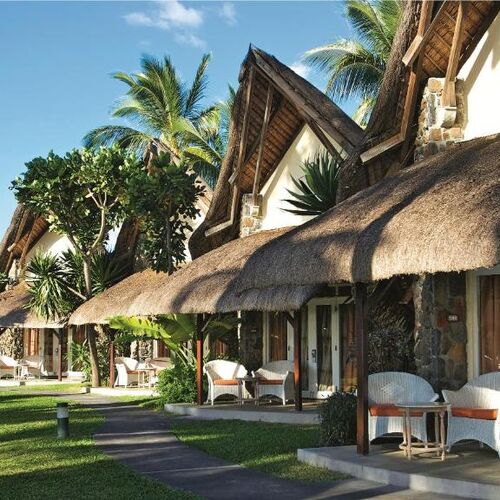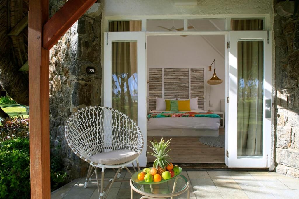 Traditionel stråtagsbungalow for to, med højt til loftet og pulserende mauritiske møbler. Beliggende i kokosnødlunden har værelset et moderne badeværelse med separat bruser og badekar samt sin egen private terrasse med en fantastisk havudsigt.