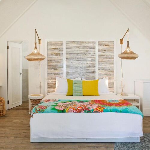 Med livlige farver og lokale kunstværker, fiskerbådsinspirerede stråtag og skrå lofter er indkvartering på La Pirogue fuld af traditionel mauritisk charme.