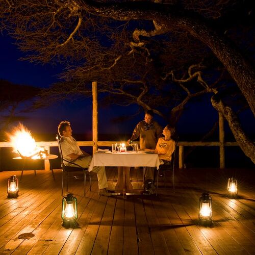 Indkvartering: Elegante telte er bygget på forhøjede træplatforme med eget badeværelse og en udendørs bruser. Efter en dag på safari kan gæsterne nyde en forfriskende bruser under stjernerne. Hvert telt har sin egen private terrasse, hvor gæsterne kan nyde landskabet og omgivelserne. Familieteltet består af to sammenkoblede telte med et fælles badeværelse og privat veranda.