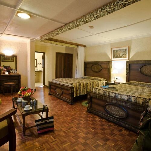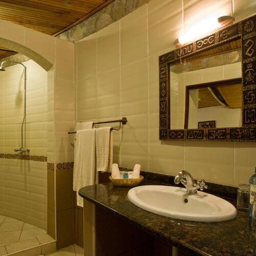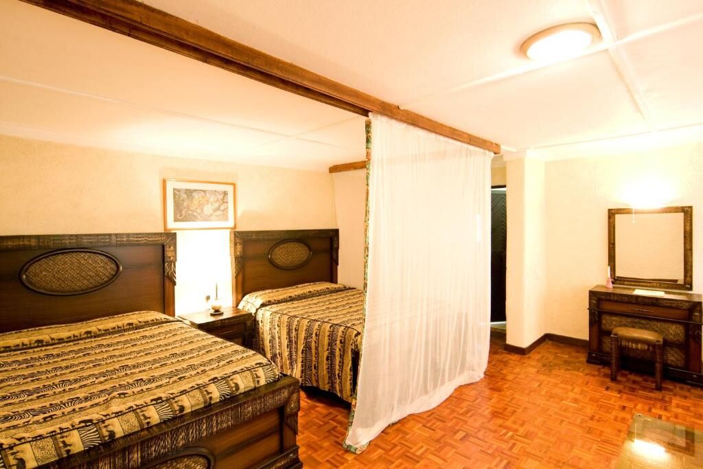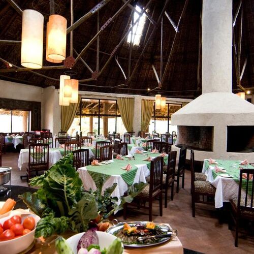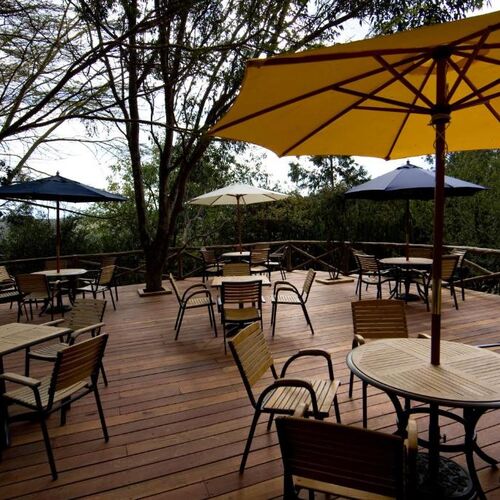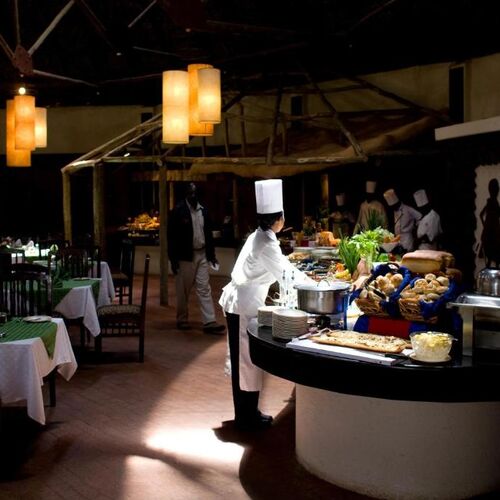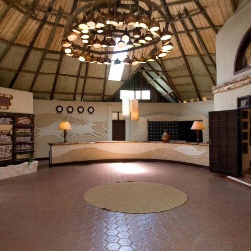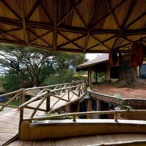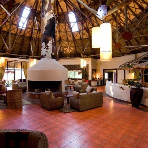 All building in the lodge follow the design of traditional African round houses with conical thatched roofs, and fits in beautifully with the surrounding countryside. The property’s 99 rooms, including 12 suites, are divided into two wings on either side of the main public areas. There are 50 cottages, each divided into two rooms with onsite bathroom and a covered veranda with views of the well-established gardens and the Masai Mara below. The large main building has a convenient central location and features the restaurant, lounge, and sun terrace, below it is an out-door swimming pool with a poolbar and sitting area. The circular lounge building has a huge fireplace and a 20 meter high chimney, reaching all the way to the top of the conical thatched roof. Just below the pool is the Ol Murrani Bar, a stand alone building with an adjacent open camp fire area. There is also a huge timber deck from where you can view predators such as hyenas, mongooses and honey badgers that come to eat the meat that is put out for them every night.