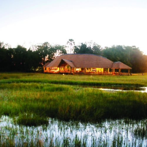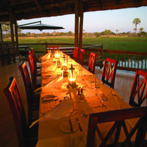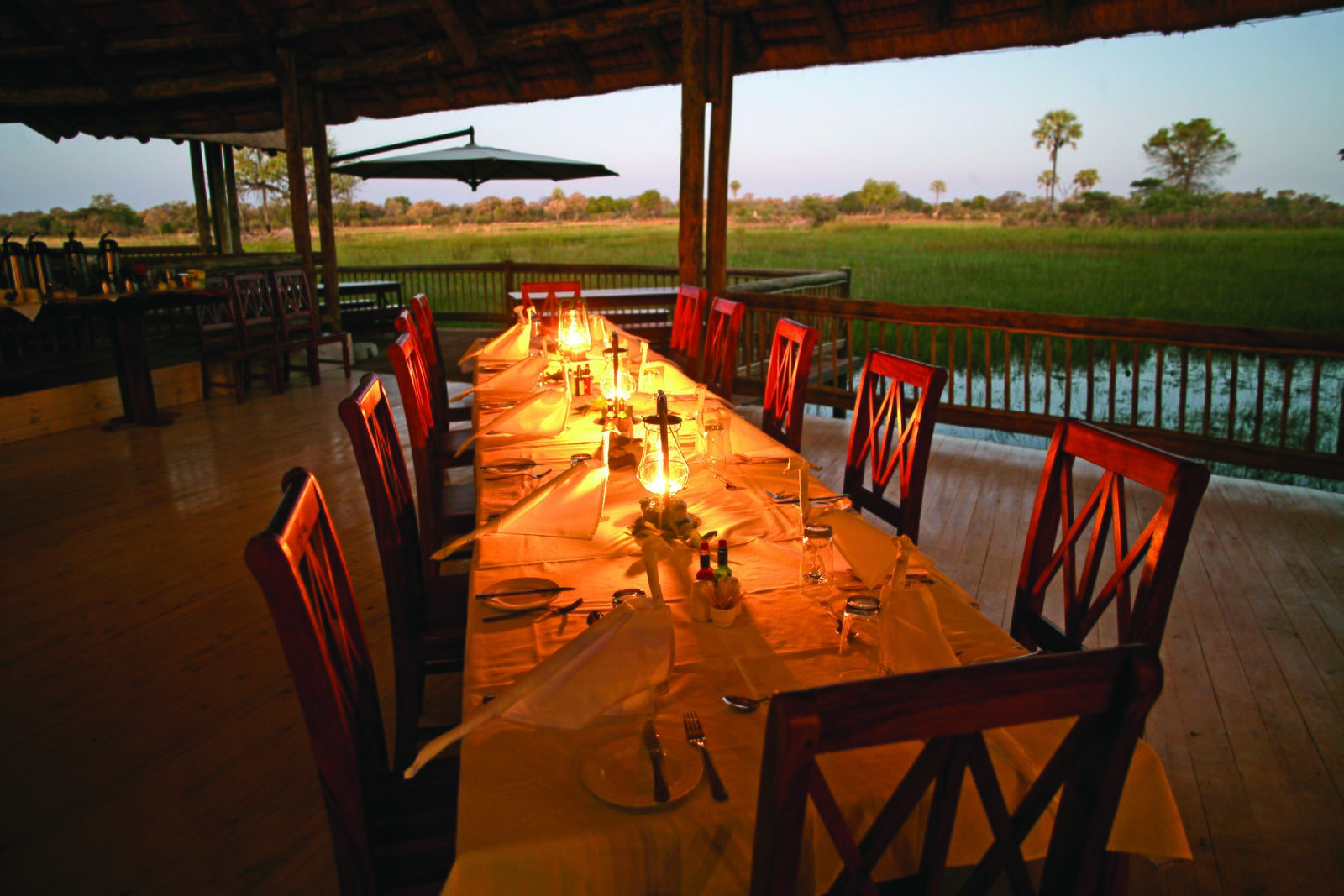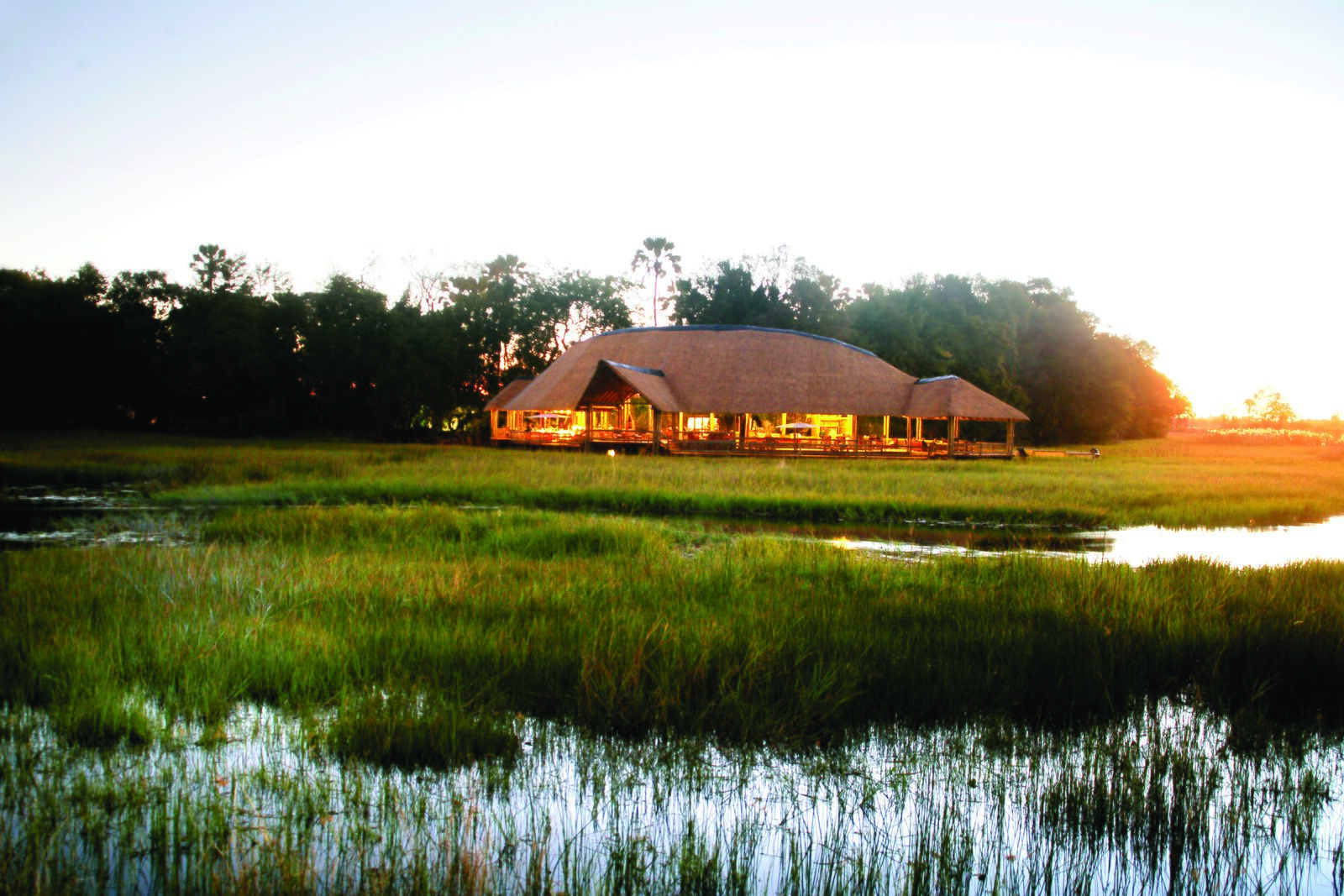 hvor tørt land møder vand. I modsætning til det nordlige Okavango-delta hvor udsigten er domineret af høje siv og papyrus, tilbyder kanalerne omkring Moremi Crossing og dens søsterlejr Gunns Camp vidtrækkende udsigt over Moremis flodslette med græsarealer, skovområder og spredte større eller mindre palmeklædte øer. Lodgens centrale opholdsområde rummer et stort åbent dæk, med en spektakulær udsigt over Boro-floden over til Chief’s Island. Dette halvmåneformede område er bygget i forskellige niveauer. Spisestue, bar og lounge er dækket af et stort stråtækt tag.