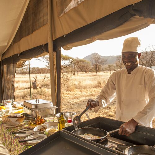Ndutu Kati Kati tilbyder et fællestelt med spiseområde og lounge, hvor måltider serveres og gæster kan slappe af. Maden er frisklavet og varieret, med et mix af internationale og lokale retter.