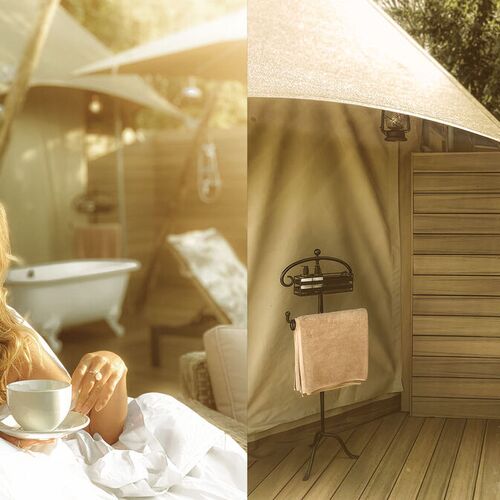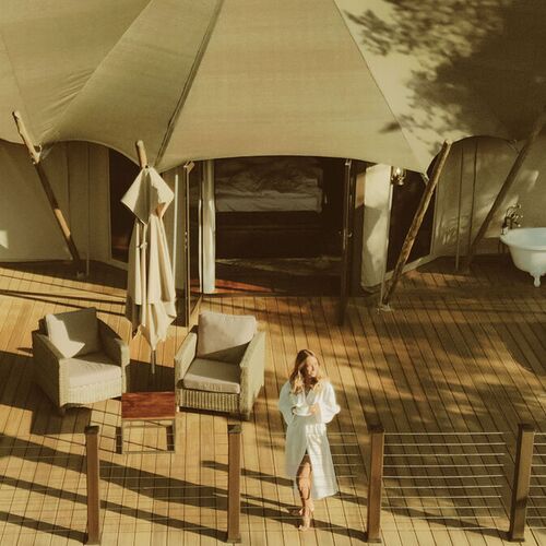 Her får man en fantastisk glamping oplevelse ud over det sædvanlige, og en standard som svarer til en 5-stjernet hotelstandard, blot i telte.