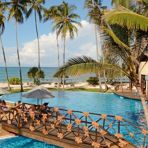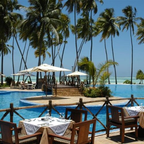 The resort has three restaurants, all with good locations. The Ocean Restaurant is on the top floor offers a panoramic view over the resort and the ocean below. The Jahazi Restaurant is next to the swimming pool and the Mawimbi Restaurant is adjacent to the beach. Additionally there are a number of bars.