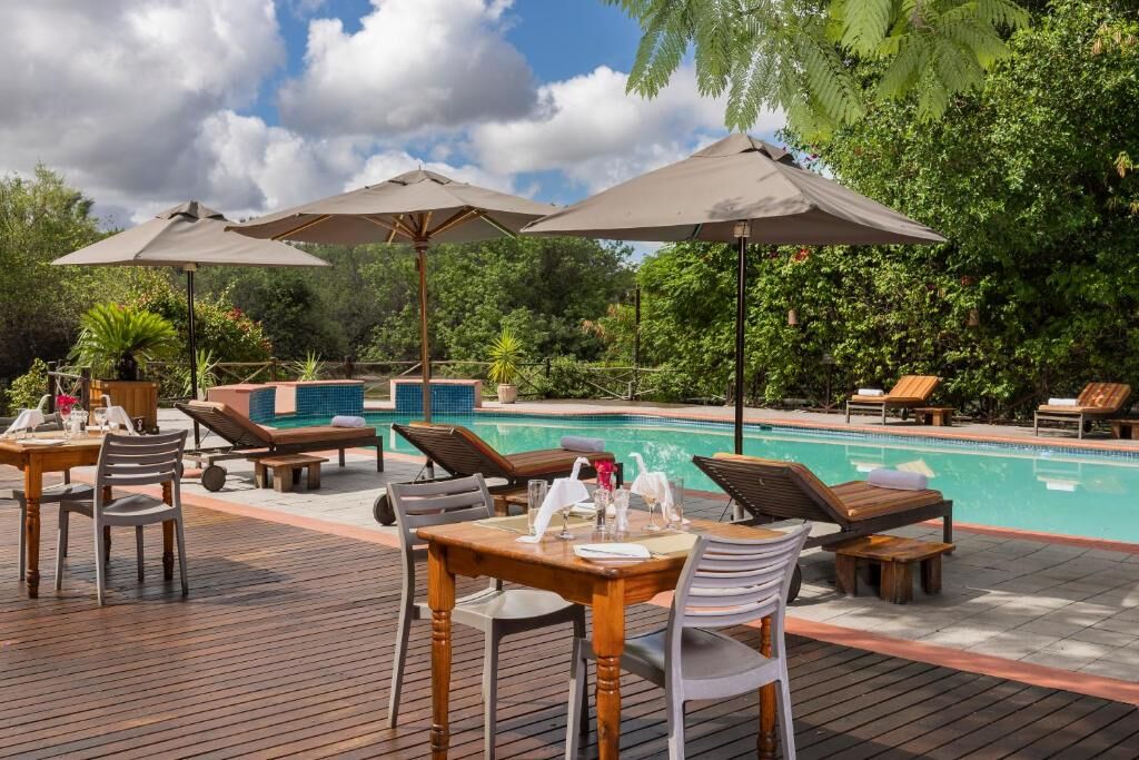 Den store swimmingpool er omgivet af en hævet teaktræsplatform og skygges af et enormt jacarandatræ, hvor du kan nyde måltider og forfriskninger.