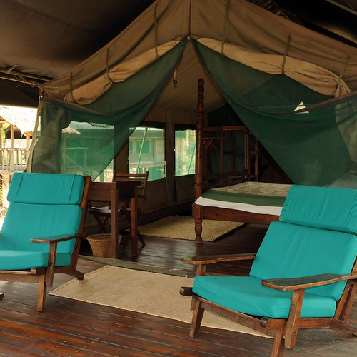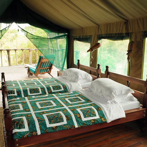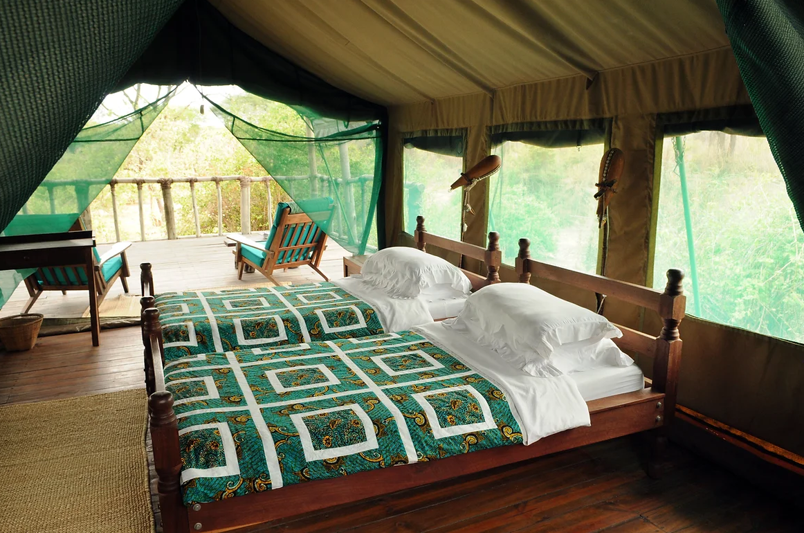 Elleve rummelige, forhøjede luksustelte tilbyder forskellige arrangementer af dobbelt- eller enkeltsenge. Ekstra senge er tilgængelige for børn eller en tredje person. Belysningen leveres af solenergi døgnet rundt, og hvert telt står mindst otte meter væk fra det næste for fuldstændig privatliv og afsideshed. Det indbyggede badeværelse bag hvert telt er indrammet i strå og sten og har udsigt over bushen. Solopvarmede brusere tilbydes. Foran hvert telt er der en rummelig veranda med komfortable siddepladser, perfekt til afslapning og dyresafari langs Mdweka-sandfloden.