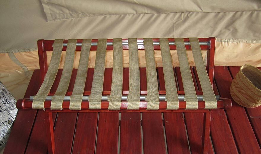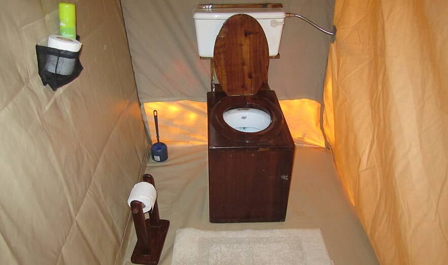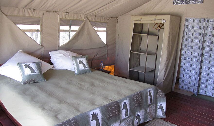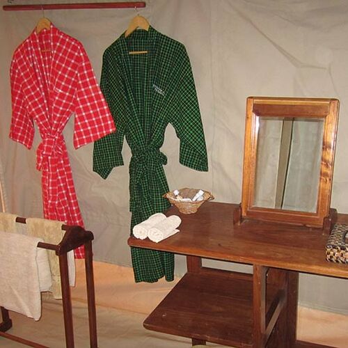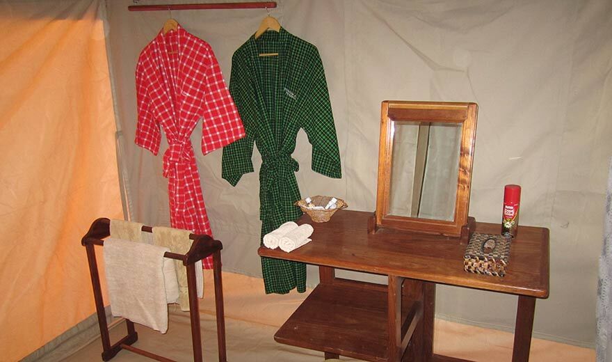 De luksuriøse telte er høje, så man kan både stå og gå inde i dem. Der er senge af træ, madrasser, dyner, tæpper, puder og sengeborde. Der er toilet-og badfaciliteter bagerst i teltet og afskærmet af kanvas teltdug. Udenfor teltet er der en veranda med to safaristole og bord, så man kan sidde udenfor sit telt og nyde naturen, lydene og slappe af midt i det afrikanske safarieventyr.