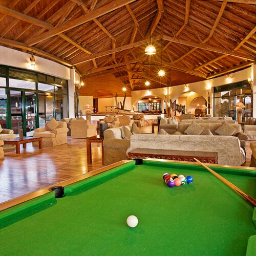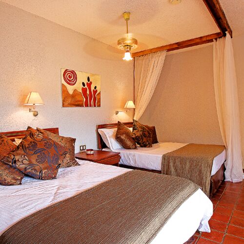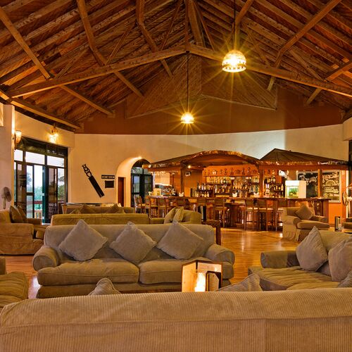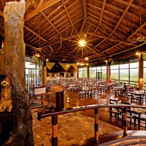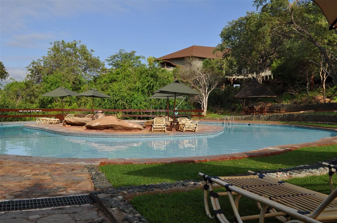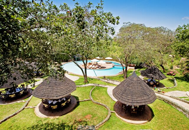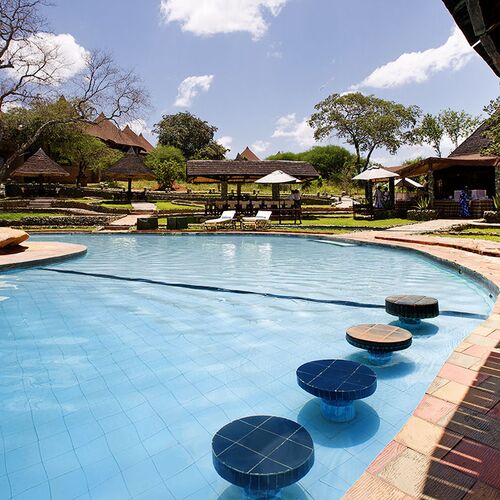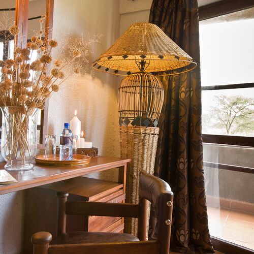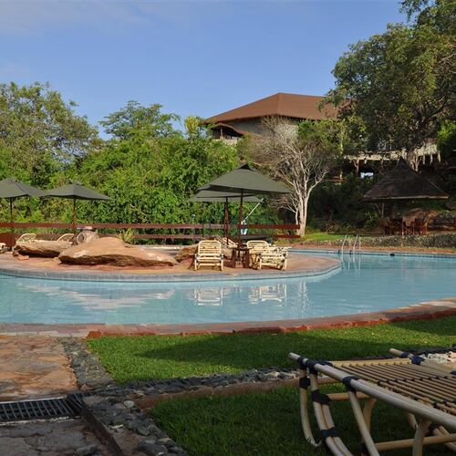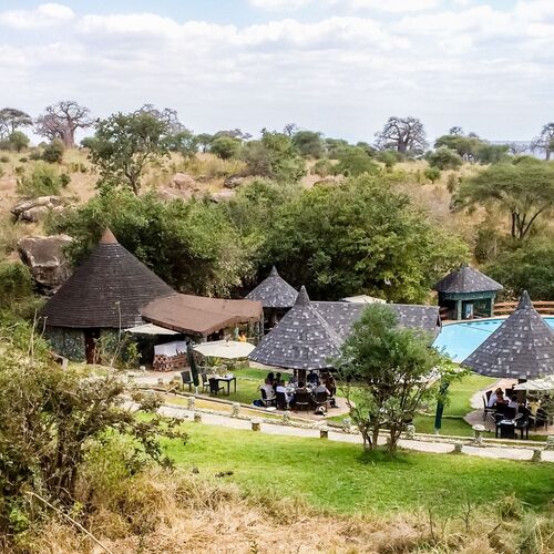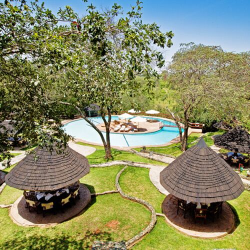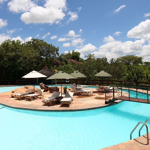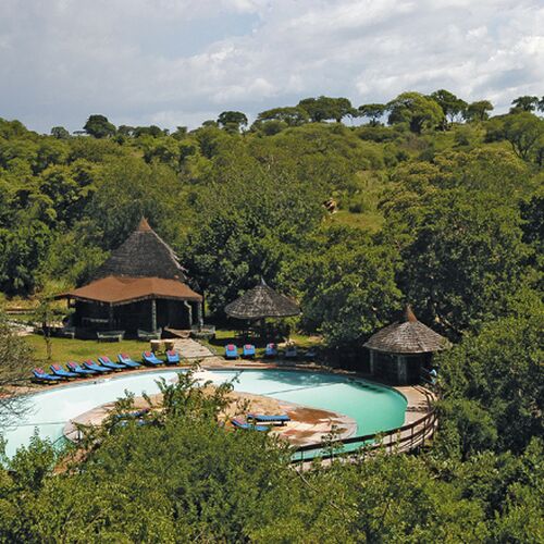 The lodge has 75 rooms in circular buildings with conical roofs, inspired by African villages. They lie in blocks of four, scattered on either side of the common areas. Each building houses two rooms on each floor. Each room has its own bathroom, lounge and veranda overlooking the surroundings. The lodge can accommodate 150 guests. The lodge has a swimming pool, with wooden bridge leading to an island in the middle. The lodge is 118km/a 2 hour drive south west of Arusha. The flight time to Arusha is 20 minutes, plus a 40 min. Transfer time from Kuro Airstrip to the lodge.