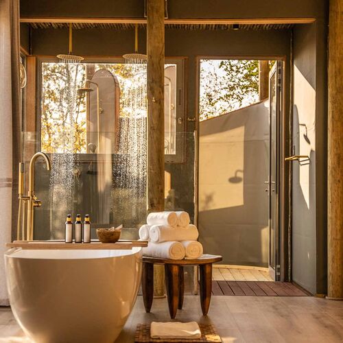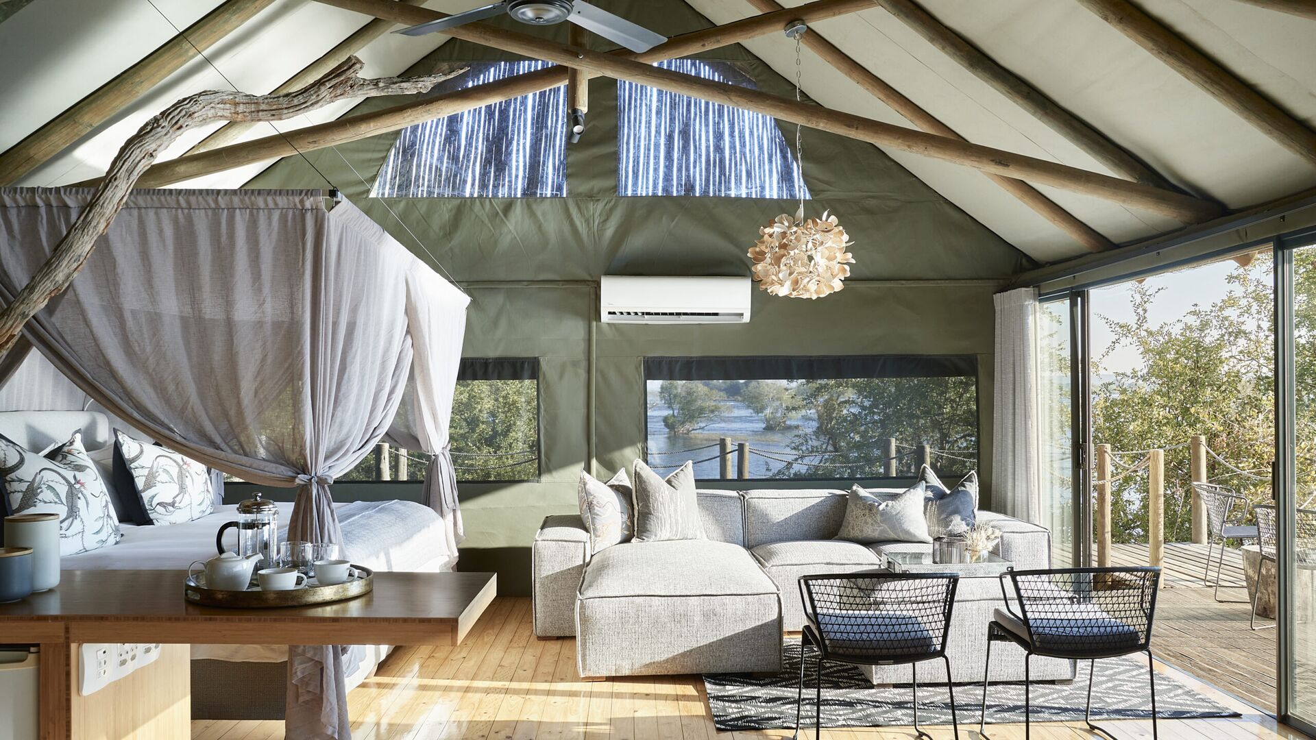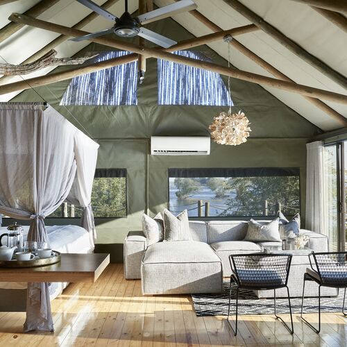 Her er der luksus-telte, luksus familie-telte, superior familie-telte, eksklusive villaer, Malachite luksus telt-suiter længere nede af floden, samt tree houses og star-bed tree houses på en lillebitte privat ø.