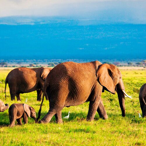 Every day the elephants move in from the surrounding forests on to Amboseli’s flat plains to drink and bathe in the freshwater marshes, where they mix with the parks other classic big game animals such as hippopotamus, buffalo, wildebeest, zebra, gazelles and giraffes. The spotted hyena is the park’s most numerous predator, but here you can also find a couple of prides of lions and the individual leopard and cheetah. The park’s birdlife is impressive, more than 400 species have been seen here, of which the incredibly beautiful crowned crane is perhaps the district’s most characteristic.