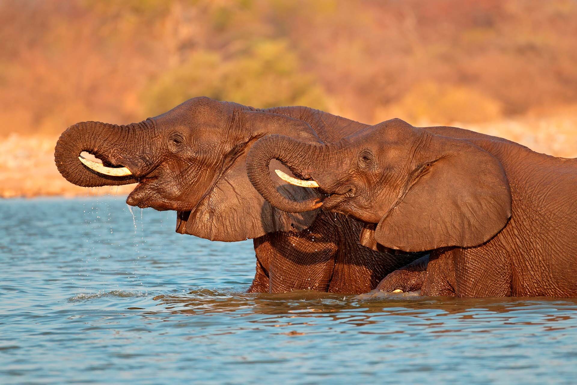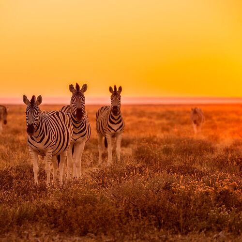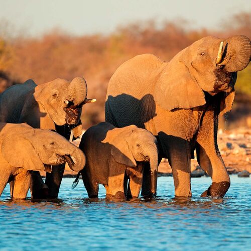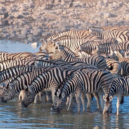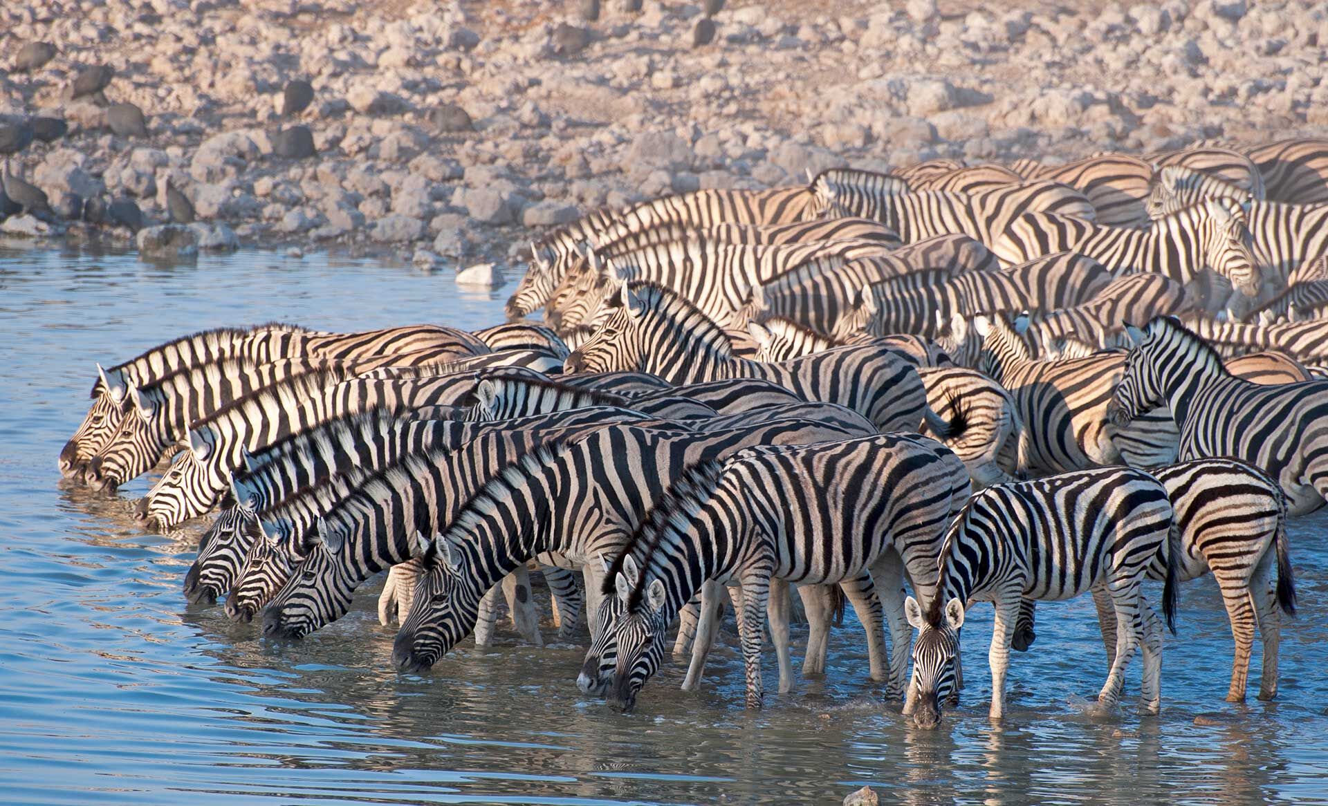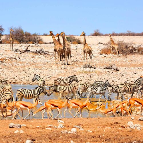 During the dry season before the summer rains fall, the waterholes make for a very impressive sight, especially around dawn when groups of many different species of animals arrive at them to drink, as they don’t dare come here during the hours of darkness because of their fear of the predators with good night vision. If elephants arrive at the waterholes, they usually see off the other animals, as they like to have the spot to themselves. The arrival of predators will also cause the other animals to disappear - all apart from the elephants. The many rhinoceros typically come to drink during the night, when a few of the waterholes are floodlit allowing visitors to see them. Etosha is home to an impressive number of birds all year round , including many birds of prey and ostriches. The park can be driven to from Namibia’s capital, Windhoek, along around 450km of good asphalt roads.