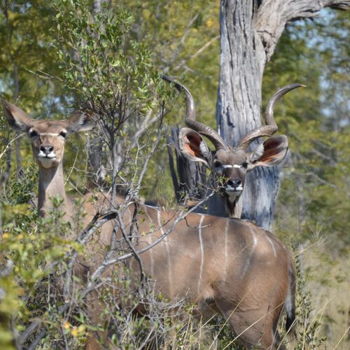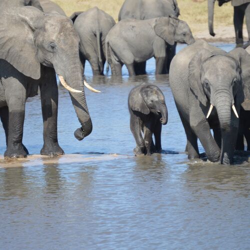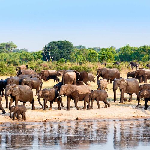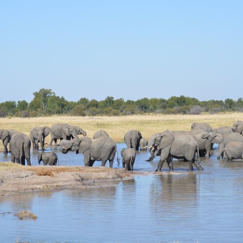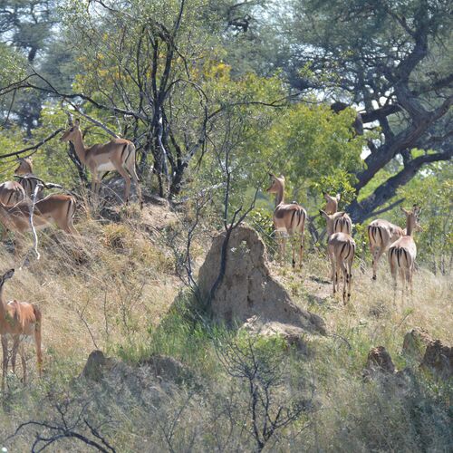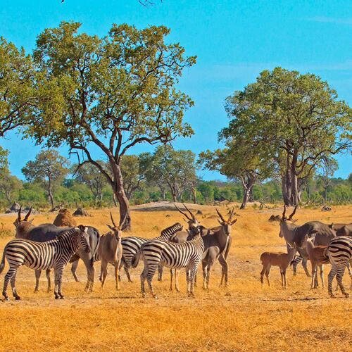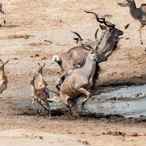 The nature of the accessible northern third of the park is a mix of flat, sandy areas with scattered vegetation, acacia savannah and a few more forested areas in the north east section of the park. In the north west section there are also areas dominated by more hilly terrain with granite outcrops. Around 60 waterholes can be found in Hwange, most of which are artificial. In the larger waterholes you see hippos, crocodiles and turtles. On the savannah, close to waterholes, live many giraffe, zebra, wildebeest, warthogs and countless antelopes, including some of the largest and most impressive species such as greater kudu, eland, roan, sable and waterbuck.