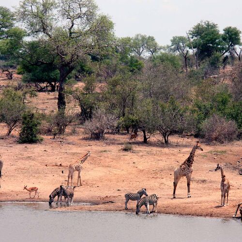 The vegetation here predominantly consists of savannah woodland, which is most lush to the south and driest in the north, where the huge, ancient baobab trees have their most southernly outpost on the continent. In amongst the areas of forest and bush you can find open areas of grassland with a number of rivers and waterholes. Kruger is home to the largest populations of animals in South Africa, and here you can also find more species of mammals and birds than in any other park. The classic “Big Five”, elephant, rhinoceros, buffalo, lion and leopard, are all common in Kruger. The park is particularly important for rhinoceros, in fact the most important on the continent, as here you can find more white rhino than in the rest of Africa, and nearly half of South Africa’s black rhinoceroses live here. Kruger also has fine populations of giraffe, zebra, wildebeests as well as many antelope species such as the greater kudu, eland, roan and sable antelopes, and here you can find more than 100,000 impalas. Baboons and meerkats are also very numerous, while the rivers are home to many crocodile and hippopotamus. The African wild dog is relatively common, and here you can also see cheetah.