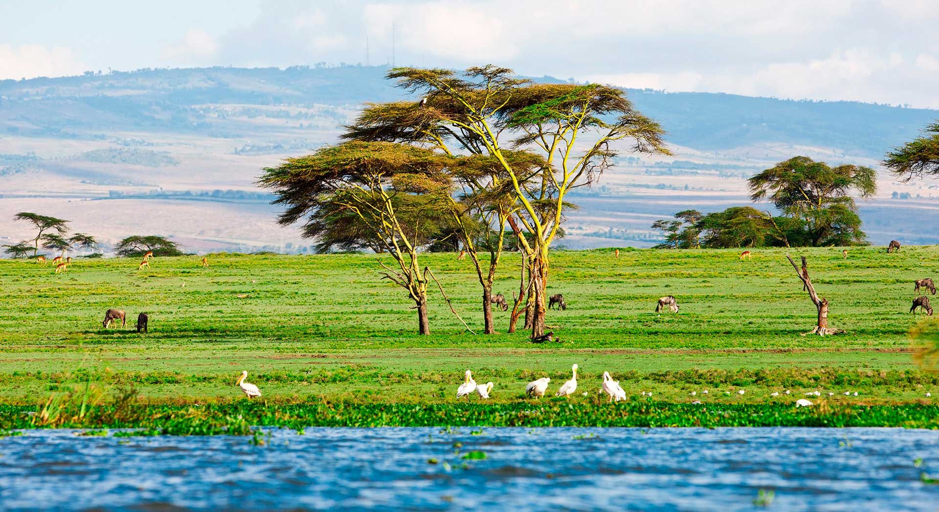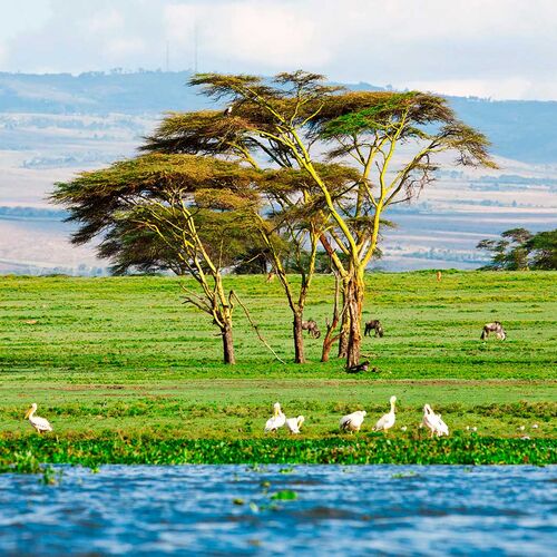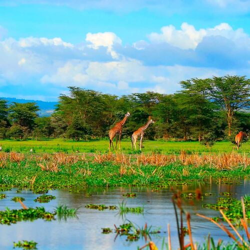 In central Kenya, on the floor of the Rift Valley, lies five large lakes. Of these Lake Naivasha is closest to the capital city of Nairobi which is around 90 km to the north west. Lake Naivasha is a freshwater lake set in very lush surroundings, and taking a boat trip along its shores is one of the big attractions as it is an absolute paradise for birds, including many water birds and the African fish eagle. The lake is also home to a good population of hippopotamus, which you can approach closely by boat, and along its shoreline you can often see giraffe, buffalo and a number of different species of antelopes and monkeys.