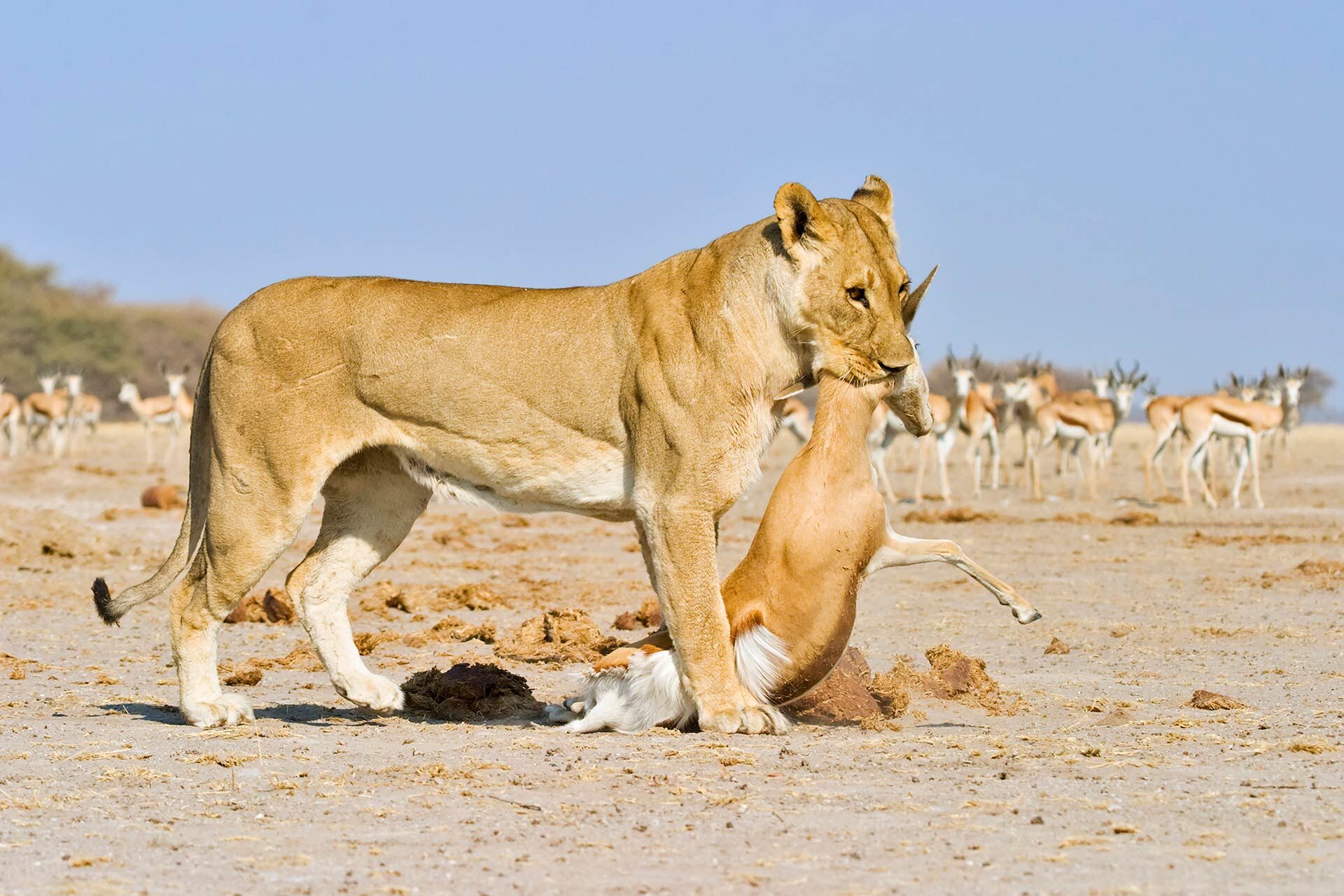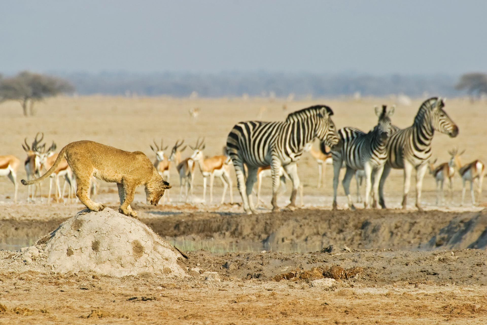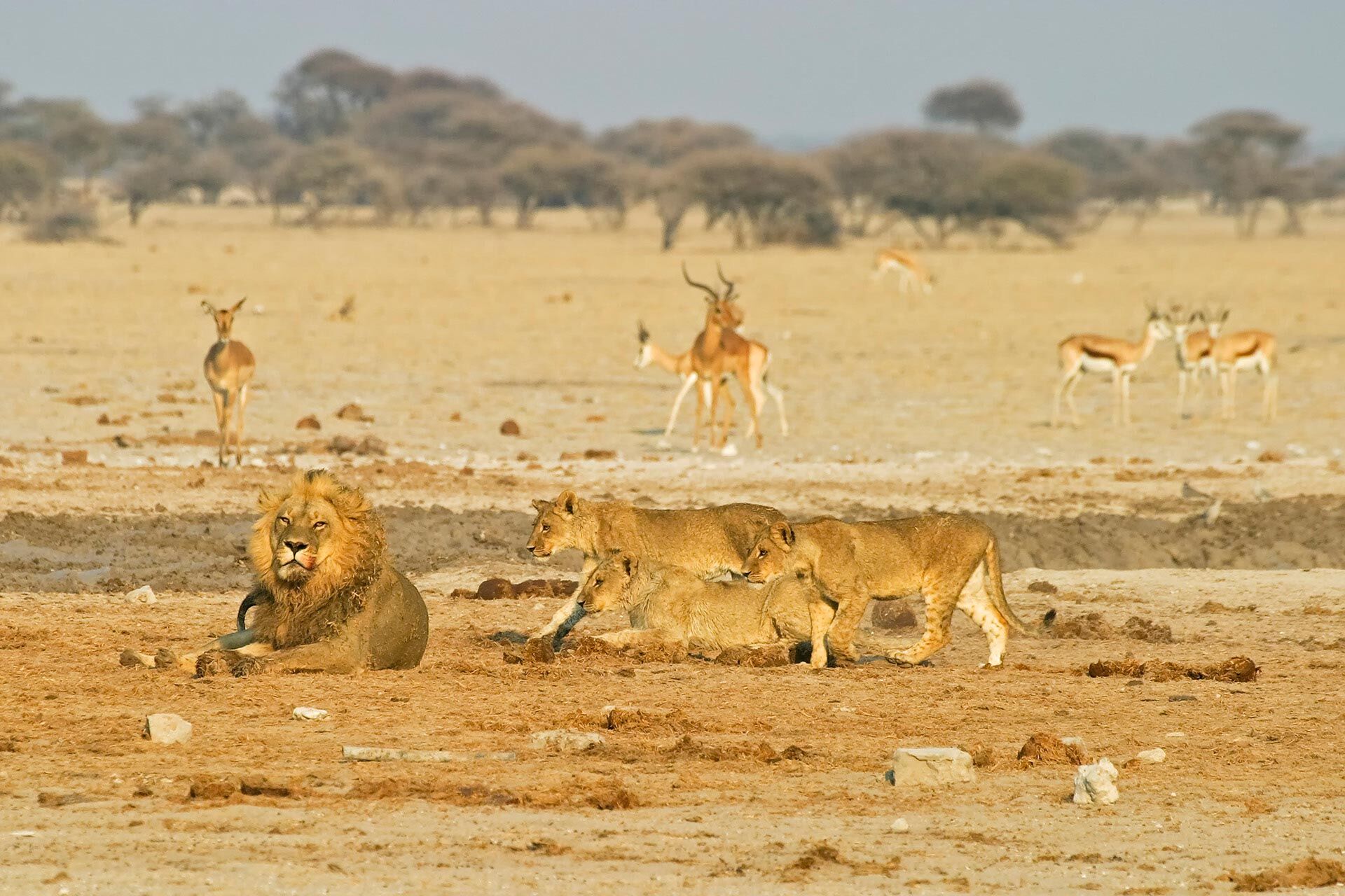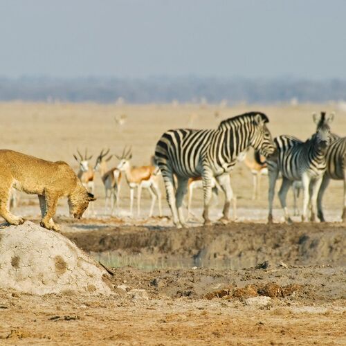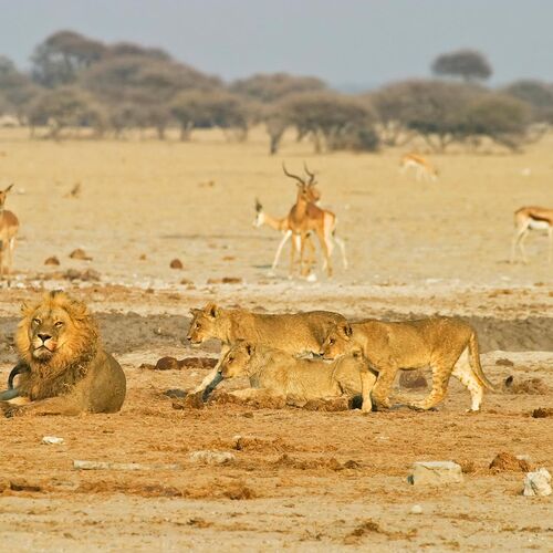 The animal life of Makgadikgadi is richest in and around the forests that grow along the Boteti River at the end of the dry season in September and November. Zebra, wildebeest, greater kudu and giraffe are the most common animals, and they are preyed upon by lions, leopard and spotted hyena. In Nxai the animals are at their most numerous during the wet summer months from December to March, when they arrive to graze on the new grass shoots growing around the salt pans. Many of the large herbivores give birth around this time. In particular wildebeest, zebra and elephants come here at this time, joining the resident springbok, giraffes and ostriches. The district is dotted with beautiful palm trees, and the unique baobabs, with their gigantic trunks. Cheetahs are very common on the grassy plains, while there are good numbers of lions living around the waterholes in this area.