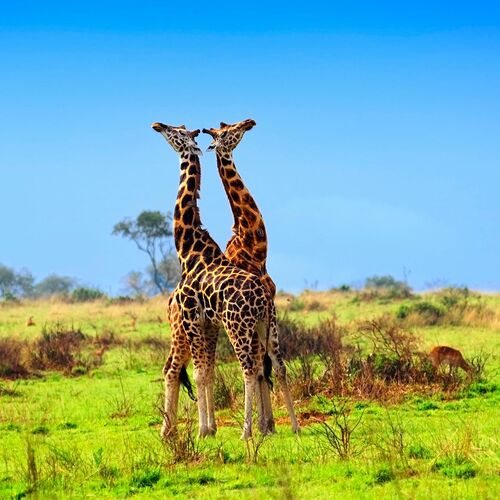 With a little bit of luck you can see the big, and rather strange looking bird, the shoebill stork, with its huge beak. For ornithologists it is one of Africa’s most sought after birds and seeing one will be a coveted record in their notebook. Amongst the birds of the savannah it is the stunningly beautiful crowned crane that is Uganda’s national bird and is represented on its flag that often steals the show in Murchison Falls National Park. Amongst the large mammals living in the park, lions, buffalo, warthogs and Rothschild’s giraffe, which resembles a cross between a reticulated giraffe of northern Kenya and the Masai giraffe of the south, and a wealth of antelope species are often seen here. Amongst the antelope the beautiful Uganda kob is a real speciality of the country.