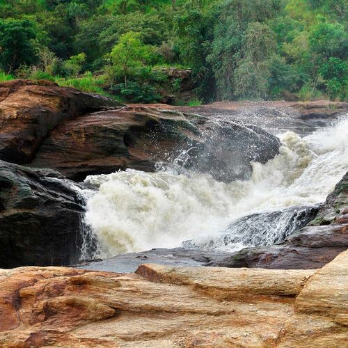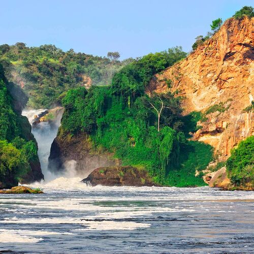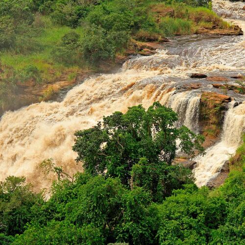 This national park, Uganda’s largest, lies in the north west of the country some 350 km north of the capital city of Kampala. It is intersected from the east to the west by the Victoria Nile. To the west the park is bordered by Lake Albert, which the Victoria Nile flows into, and is the source of the White Nile (sometimes known here as the Albert Nile). Lying in the center of the park are the impressive waterfalls that give the park its name. Even though they are not particularly tall or wide, they are almost the most powerful. All the waters of the Nile are forced through a narrow gorge, no more than 10m wide, after flowing over the 43m high falls, which churns the surface of the river into foam, which can be seen floating on the river far below the falls. The northern and southern sections of the park are connected by a short ferry crossing to the west, and by the main road to the east of the park that crosses the river close to some smaller waterfalls on the Nile.