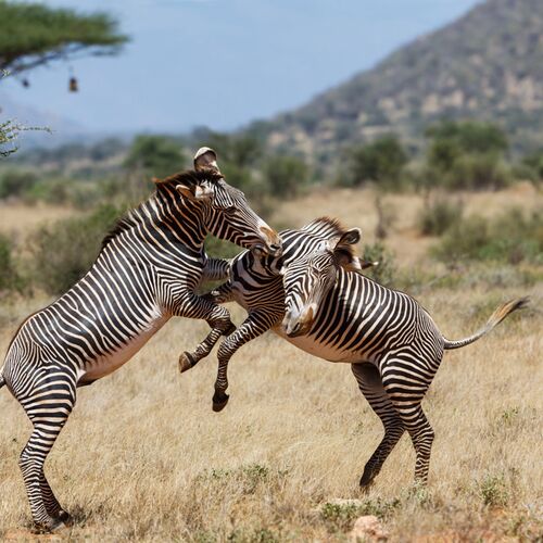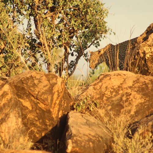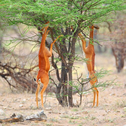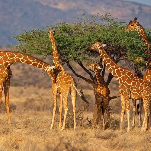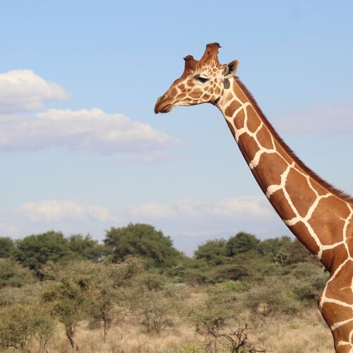 The three reserves north of Kenya’s highlands, Samburu, Buffalo Springs and Shaba, which together cover around 500 km2, have a couple of things in common: from their beautiful dry savannah landscapes, on a clear day you can see the jagged peaks of Mt. Kenya over 5,000 meters in height, plus the fact that they are all home to a range of rare animals, whose colour, shape or patterning is very different from their relatives to the south. The reticulated giraffe is genetically speaking, the subspecies that differs most from other giraffes, while the Grevy´s zebra is larger and has much thinner stripes than other species of zebra. The local gazelle, the gerenuk or giraffe gazelle, has a longer neck than the other species of gazelle, and often stands on its backlegs to feed on leaves in the higher up branches of the trees. The ostriches found here are of the species Somali ostrich, which differ from the Masai ostrich found to the south of the Kenyan highlands by the males having blue legs rather than red. The helmeted guinea fowl, which is commonly found all over East Africa, can be seen living in company of the vulturine guinea fowl, which can be recognised by its glossy blue neck.