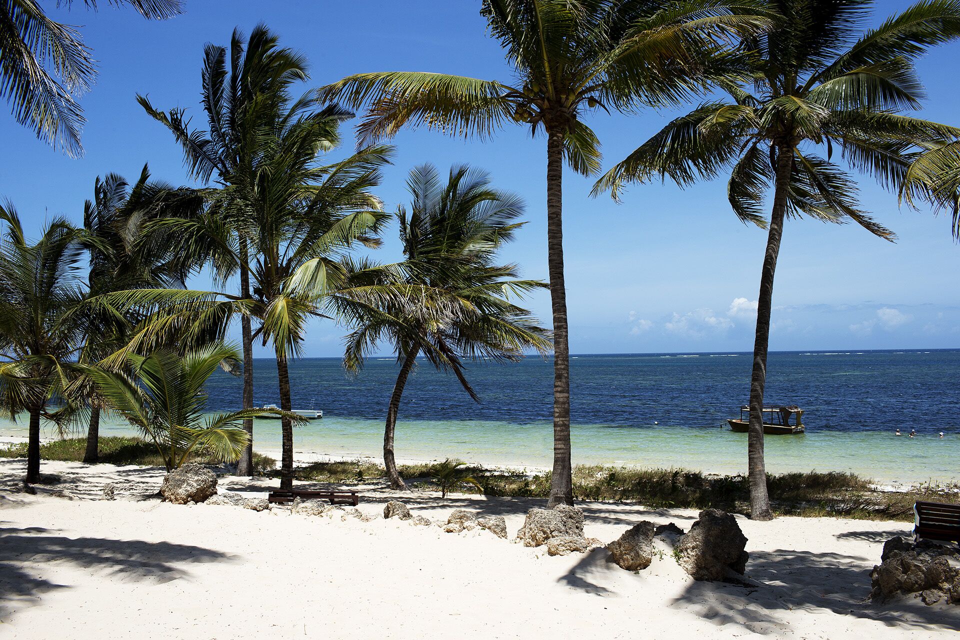 If you feel need for a bit of city life, Mombasa, which is Kenya’s second biggest city with a population of over 1 million inhabitants can, for example, offer some great shopping in the old town around Fort Jesus or at one of the co-operatives for local arts and crafts. If you haven’t yet had your fill of life on safari, or haven’t experienced a safari at all, the beautiful little Shimba Hills national park, only 20 km from the coast, can provide a touch of deja-vu or a taste of what a safari is like: here you can see elephant, buffalo, giraffes and a number of antelope and primate species together with a wealth of birds, in its lush, hilly terrain.