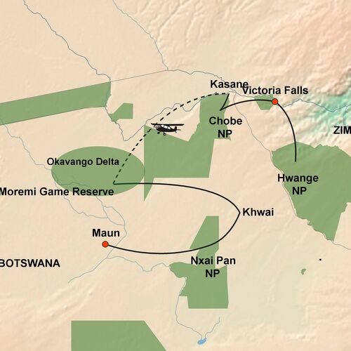 This wonderful tour takes you to two different countries. Starting in Botswana and ending in Zimbabwe, most of the tour will be in Botswana’s beautiful reserves and national parks, where you really feel close to the wilderness. Botswana has some of the most exclusive wilderness areas in Africa, and this safari offers many different impressions and plenty of exciting game drives. The tour ends at one of the biggest waterfalls on earth, the truly impressive Victoria Falls.