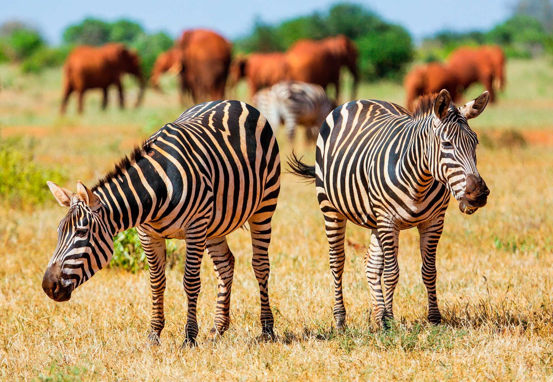 Read moreKenya’s largest national park, the vast expanse of Tsavo covers a total of 23.000 km2, which makes it one of the largest parks on the whole continent. It is divided into western and eastern sections by the main road and railway line between the country’s two biggest cities, Nairobi and Mombasa. The park is home to the country’s largest population of elephants, which numbers around 12,000 head, and the rare black rhinoceros as well as many large baobab trees. From the small western section of Tsavo, in clear weather you can see the snowy peak of Kilimanjaro. This section of the park is very hilly, the landscape dominated by recent volcanic activity. Here you can also find a number of wetlands and the impressive Mzima springs, with their hippopotamus and crocodiles, where around 220 million liters of crystal clear water gushes forth from the ground every day, a small proportion of which is enough to supply Mombassa with water via a long pipeline. This underground spring water has its original source in the rainfall on Kilimanjaro and the Chyulu Hills.