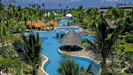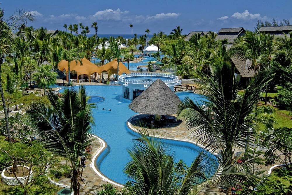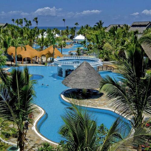 Southern Palms Beach Resort has 298 rooms, including 2 luxury suites, and lies in an approx. 10 acres of tropical gardens and has two large swimming pools, perhaps the largest in East Africa. The rooms are furnished in a Swahili inspired style and most face the pools or the gardens. 36 rooms are “Ocean Front Rooms” with a balcony and a sea view.