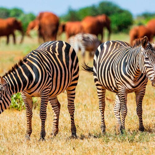 Kenya’s largest national park, the vast expanse of Tsavo covers a total of 23.000 km2, which makes it one of the largest parks on the whole continent. It is divided into western and eastern sections by the main road and railway line between the country’s two biggest cities, Nairobi and Mombasa. The park is home to the country’s largest population of elephants, which numbers around 12,000 head, and the rare black rhinoceros as well as many large baobab trees. From the small western section of Tsavo, in clear weather you can see the snowy peak of Kilimanjaro. This section of the park is very hilly, the landscape dominated by recent volcanic activity. Here you can also find a number of wetlands and the impressive Mzima springs, with their hippopotamus and crocodiles, where around 220 million liters of crystal clear water gushes forth from the ground every day, a small proportion of which is enough to supply Mombassa with water via a long pipeline. This underground spring water has its original source in the rainfall on Kilimanjaro and the Chyulu Hills.