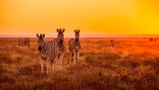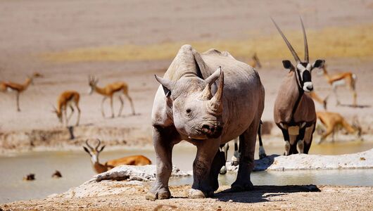 When it comes to big game then the 22,750km2 Etosha National Park is unquestionably Namibia’s finest, and it is possible to include this park amongst the most rewarding safari destinations in Africa. In the northwestern quarter of the park you can find the enormous salt flats that give the park its name. For much of the year this area is extremely dry, with white salts, left behind when the water evaporated, dusted over the soils. During the short rainy season between January and March, these flats are covered by shallow water, which gives new life to the local vegetation and attracts game animals and an incredible number of birds, with at times up to 1 million flamingos together with pelicans and smaller wading birds.