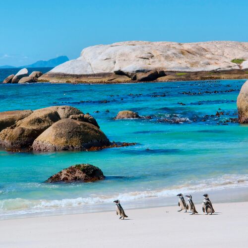 We continue to Simon’s Town and Boulders Beach which is home to a breeding colony of thousands of penguins, which swim 15km out to sea every day to hunt small fish. The penguins are permanent residents here and have lived on this part of the coast for centuries.