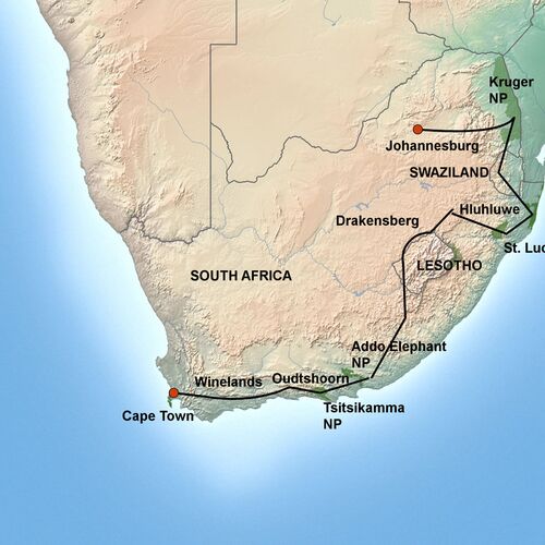 The varied sites are impressive: from the savannah of Kruger National Park with its classical African big game animals, to the dramatic mountain landscapes along the Panorama-route and in the Drakensberg Mountains, to St. Lucia's quiet wetlands and the untamed ocean along the south coast’s famous Garden Route. From Hluhluwe-iMfolozis rhinos and Addo's elephants, over exciting cultural meetings with a range of local peoples, to wine tasting in Stellenbosch and the beautifully situated international city of, Cape Town, near the Cape of Good Hope. What else could you wish for in one trip?