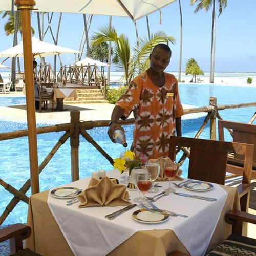 The Ocean Paradise Hotel is an African style beach hotel on one of Zanzibar’s most beautiful stretches of coastline, right next to the Indian Ocean and even having Zanzibar’s biggest swimming pool. The hotel lies on Zanzibar’s beautiful north east coast and is set in 6.5 ha tropical gardens and parkland, with direct access to the property’s sandy beach. Accommodation is provided in circular African style makuti thatched chalets. All rooms and suites have a bathroom, shower, toilet and bidet. Rooms have large French windows giving access to your own balcony facing the sea. The hotel has 98 rooms and 2 junior suites.