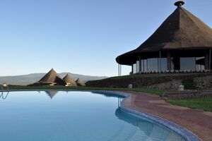 The lodge is situated high up on the 900m high Mto wa Mbu escarpment in northern Tanzania’s Arusha region. From here it offers great views over Lake Manyara and the national park of the same name and the Great Rift Valley. Lake Manyara is a 40 km long and 13 km wide, shallow, alkaline lake in a gorge within the Great Rift Valley. The water levels can vary markedly, which helps to explain the rich birdlife found here. Lake Manyara National Park covers an area of 325 square kilometers, of which 1/3 is typically covered by water. The lodge has 67 rooms, including 1 suite, in circular two story chalets with small balconies that are scattered around the property near the edge of the escarpment to give the best views over the clear waters of the lake.