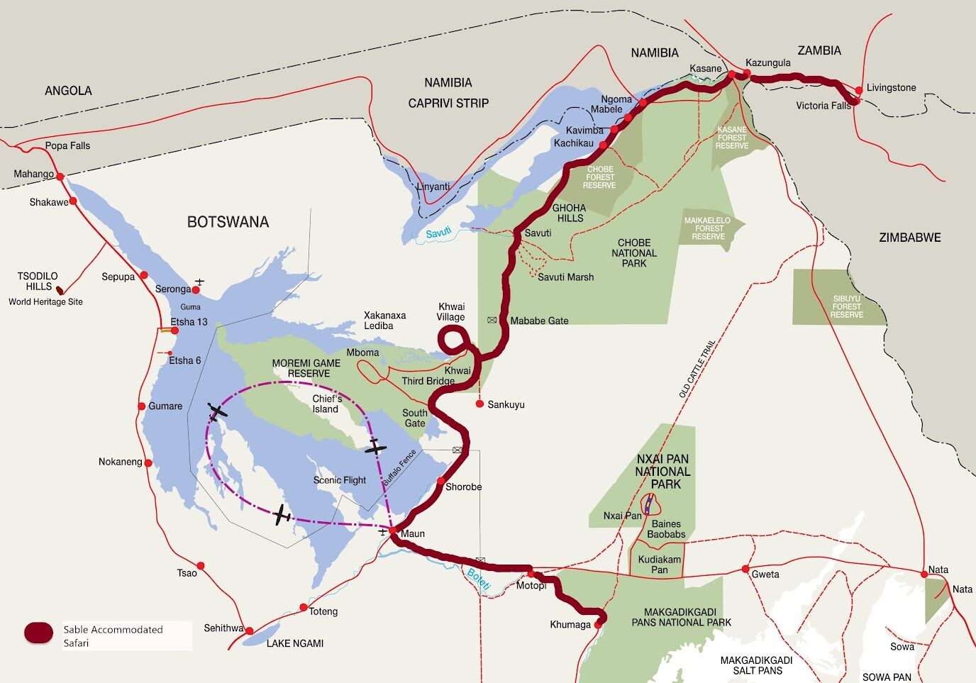 You will fly to the airport at Maun in Botswana, via an European airport and Johannesburg